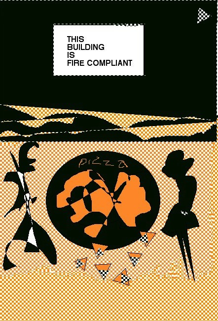 Behind us, a sign guarantees fire compliance